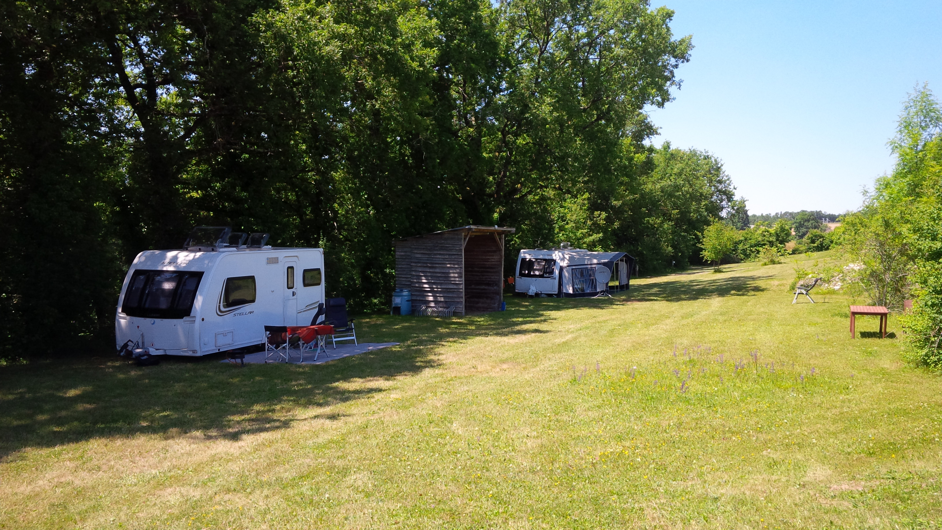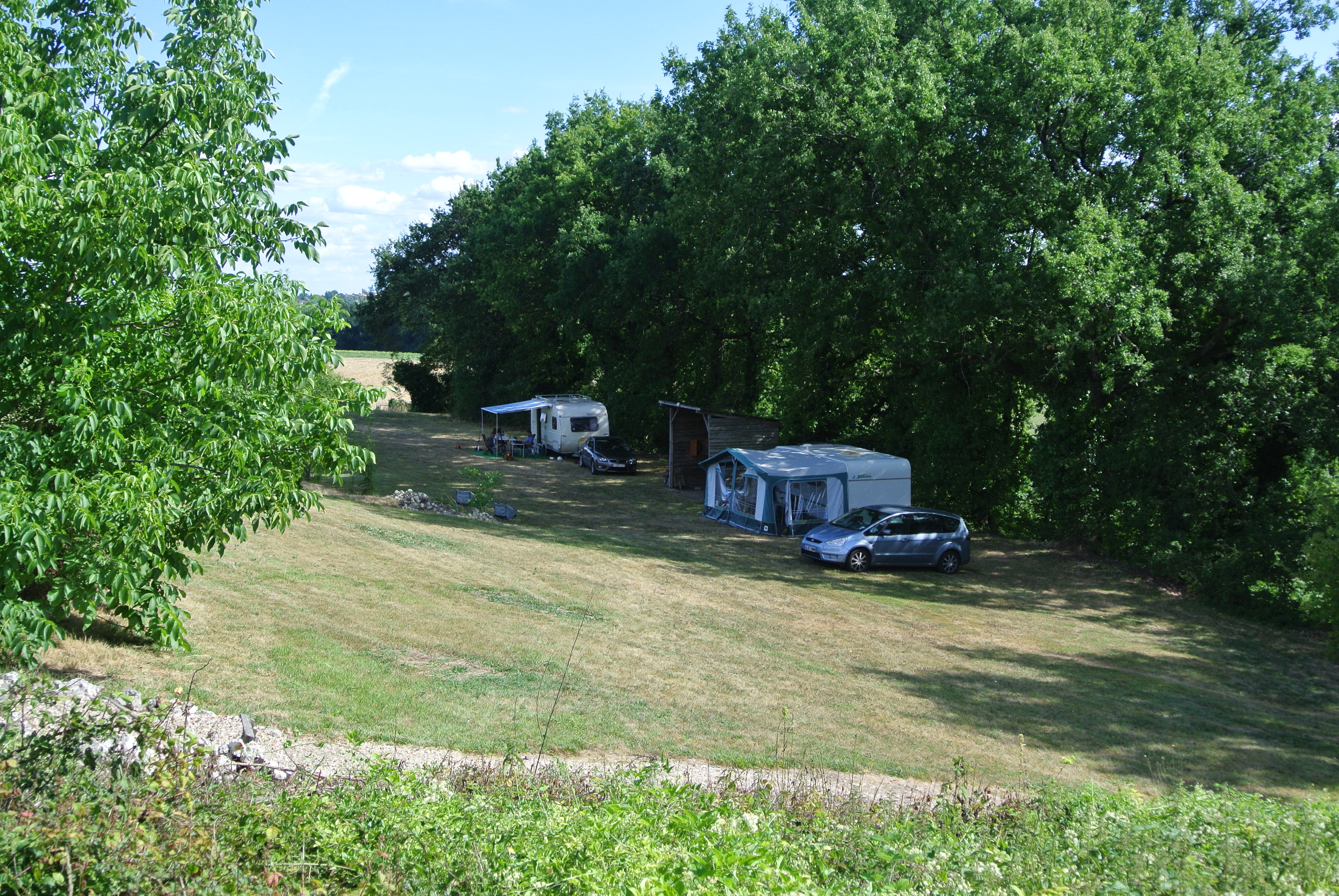 Chez Sarrazin campsite provides a delightful rural experience. There are just 6 generously-sized pitches for tents, caravans or campers (each with a minimum size of 120m2). The campsite is accessed by a chalk track with an incline of about 6 degrees. The campsite itself is mostly flat and in addition to tents is suitable for small/medium sized caravans (if towed by a suitable vehicle, ideally 4-wheel drive outside high season) and small/medium sized RVs. The campsite benefits from good shade from midday. A plan of the campsite is here.